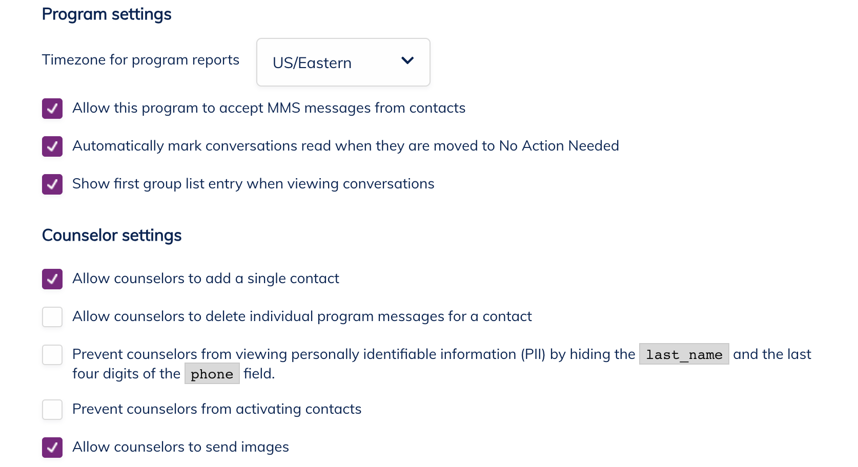 This setting allows counselors to disable individual program messages. Counselors can always delete scheduled one-to-one messages, but by enabling this feature, they will be able to remove scheduled program messages for individual contacts.