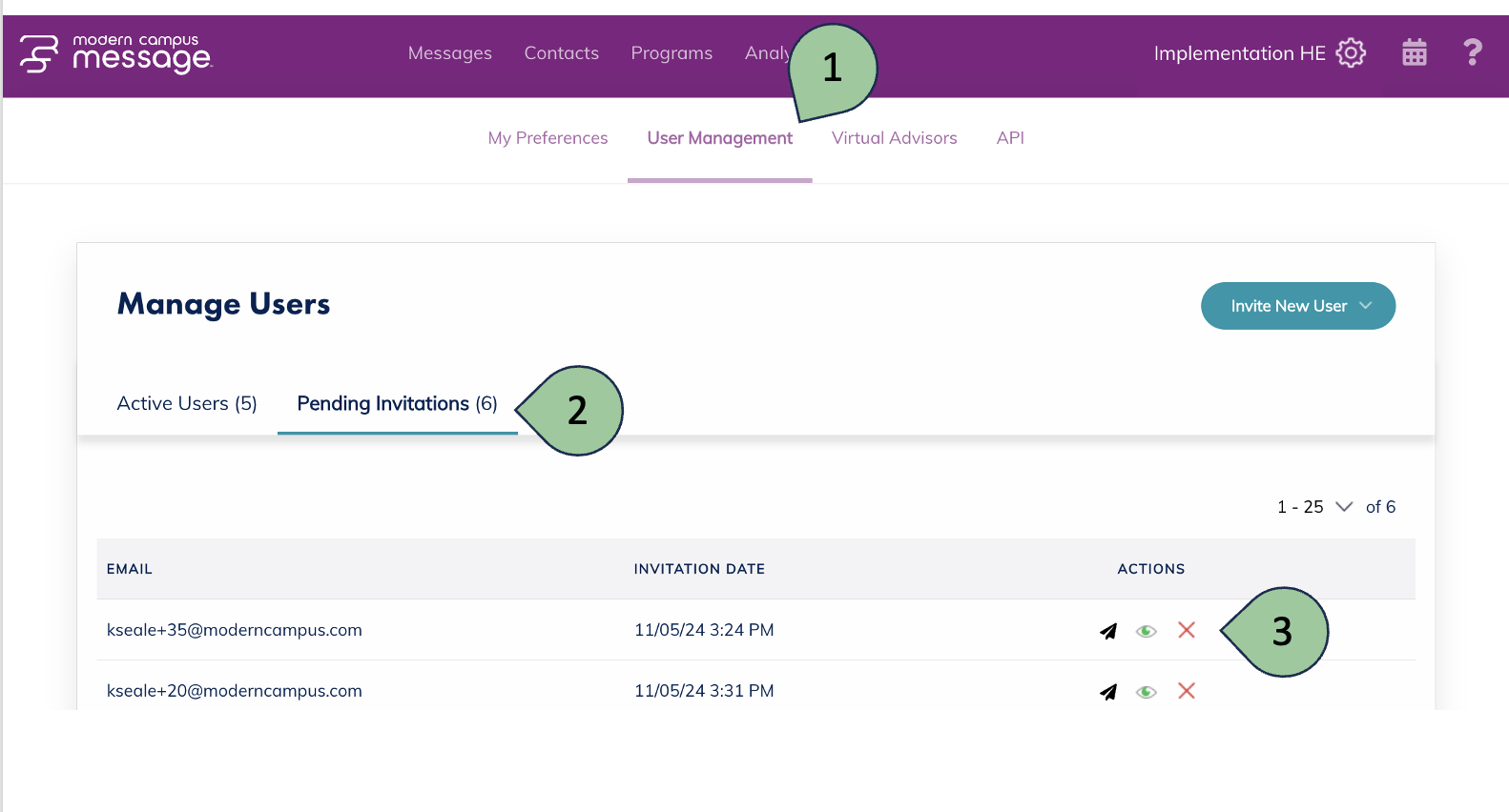 If you would like to delete a pending user (or cancel the invitation for a user who has yet to log in), select the Pending Invitations tab (2).