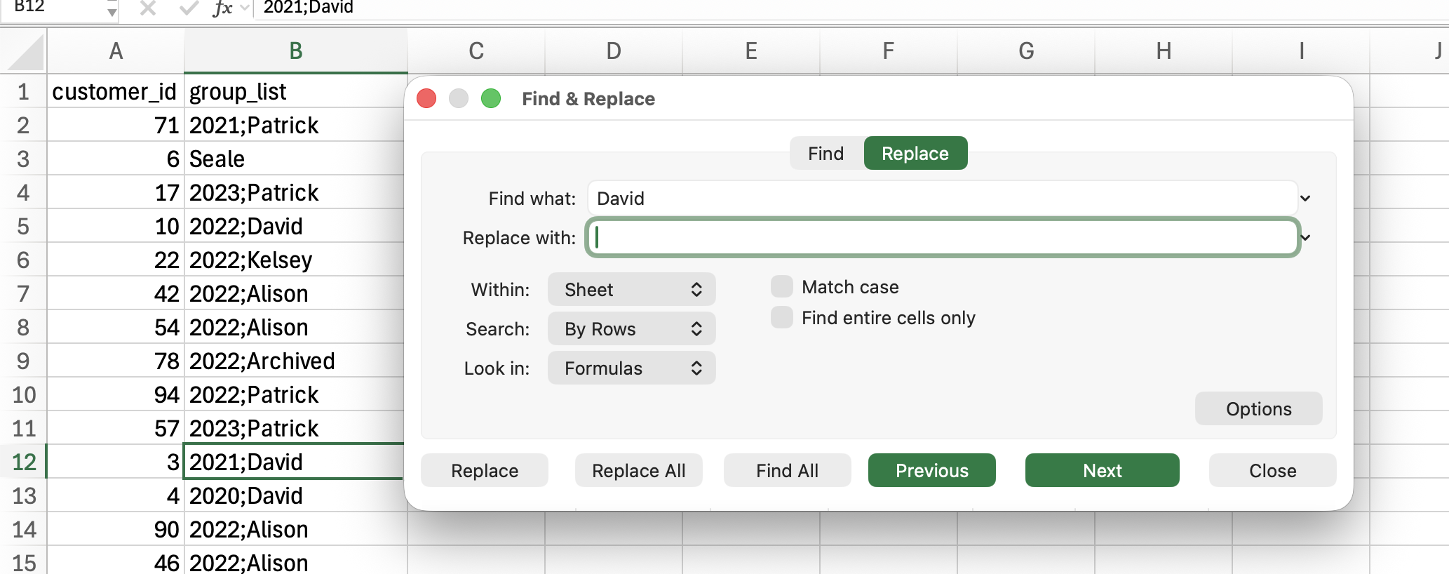 If a contact was in multiple groups, remove the group name and the associated semicolon (