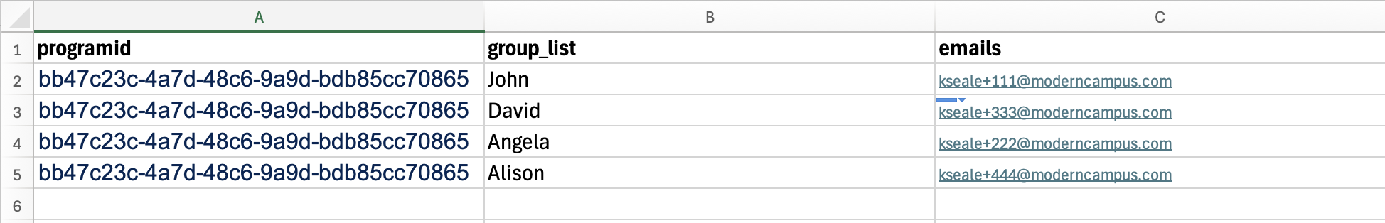 Afterward, create a file that contains the users' email and programid and group_list. Your file should look something like this when it is ready to be uploaded (make sure it is saved as a CSV file).