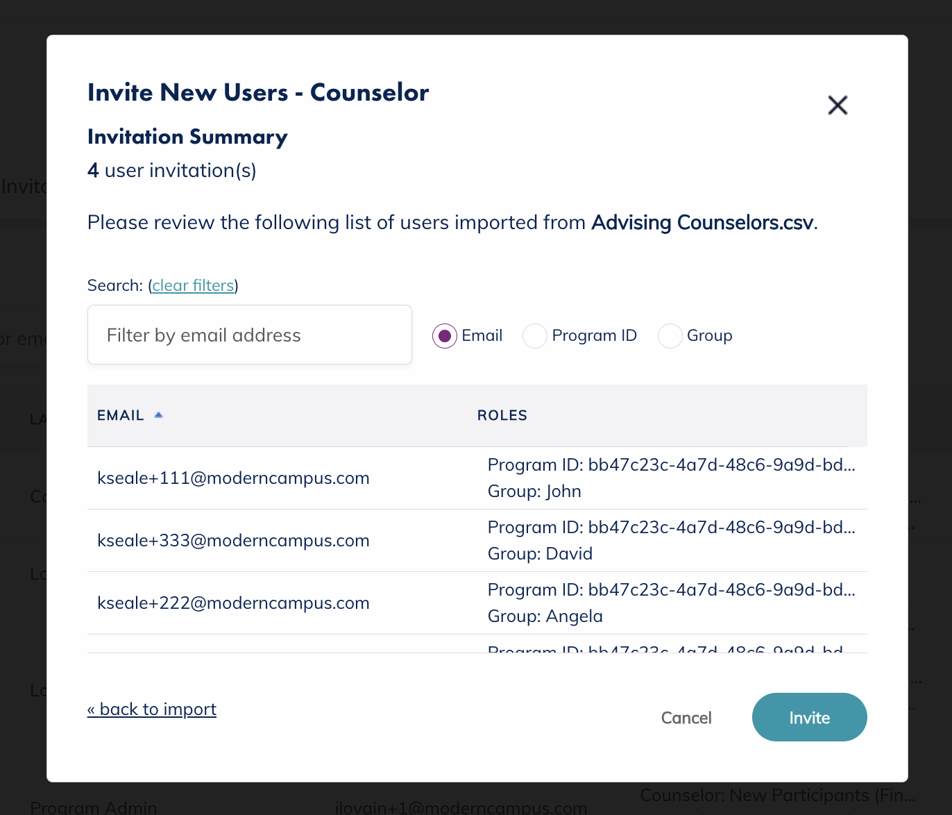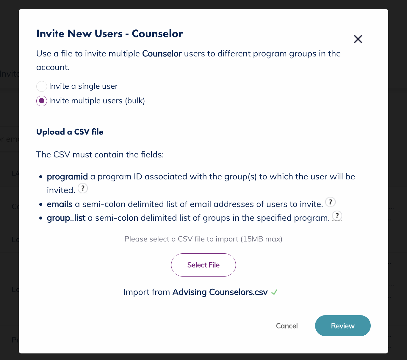 Select the CSV file from your computer that contains the user information. Then click the Review button. Use this search bar to spot check your users and the invites you're about to send. When confident, click Invite and users will receive an email invitation from no-reply@signalvine.com to create their accounts.