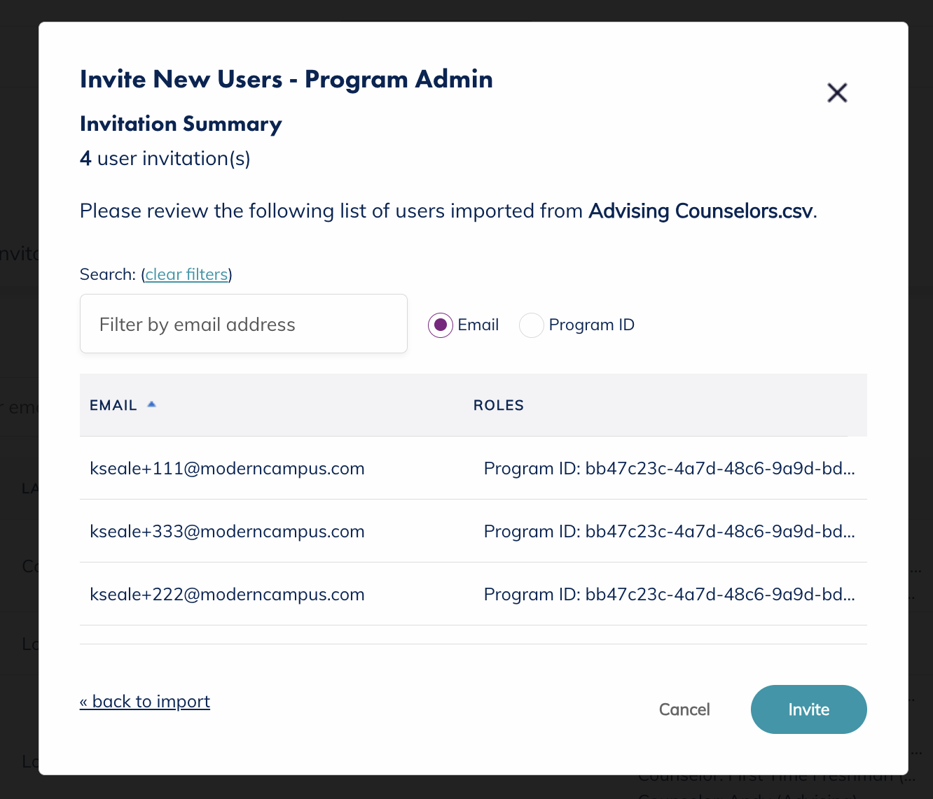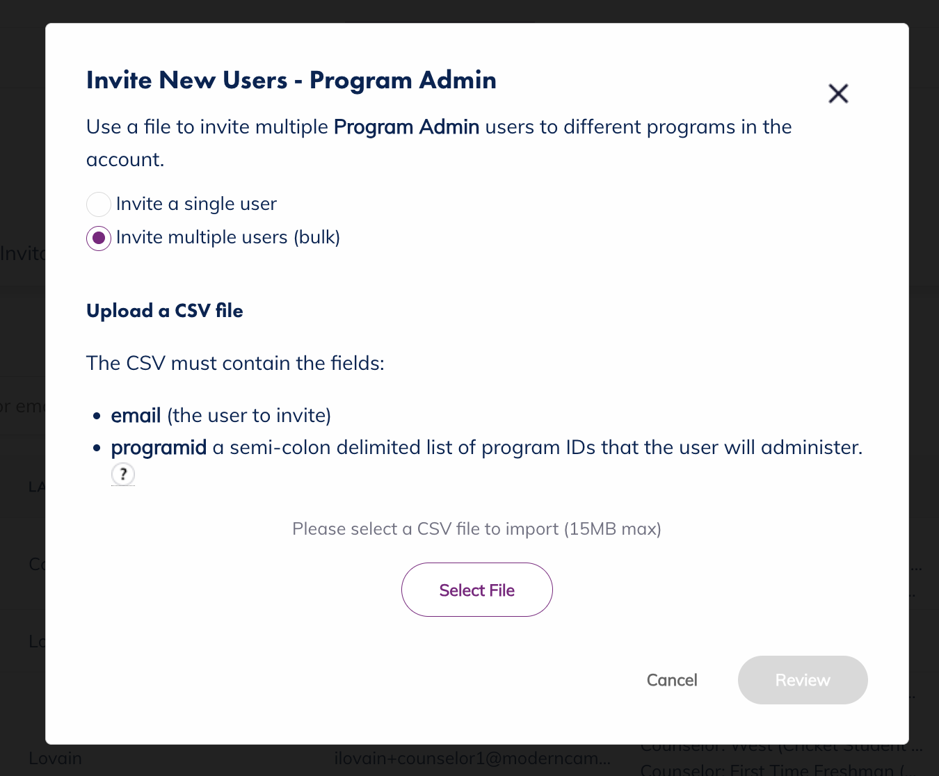 Select the CSV file from your computer that contains the user information. Then click the Review button. Use this search bar to spot check your users and the invites you're about to send. When confident, click Invite and users will receive an email invitation from no-reply@signalvine.com to create their accounts.