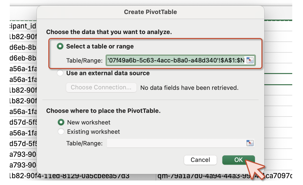 Select OK. You now have a new tab on your worksheet with a blank pivot table.