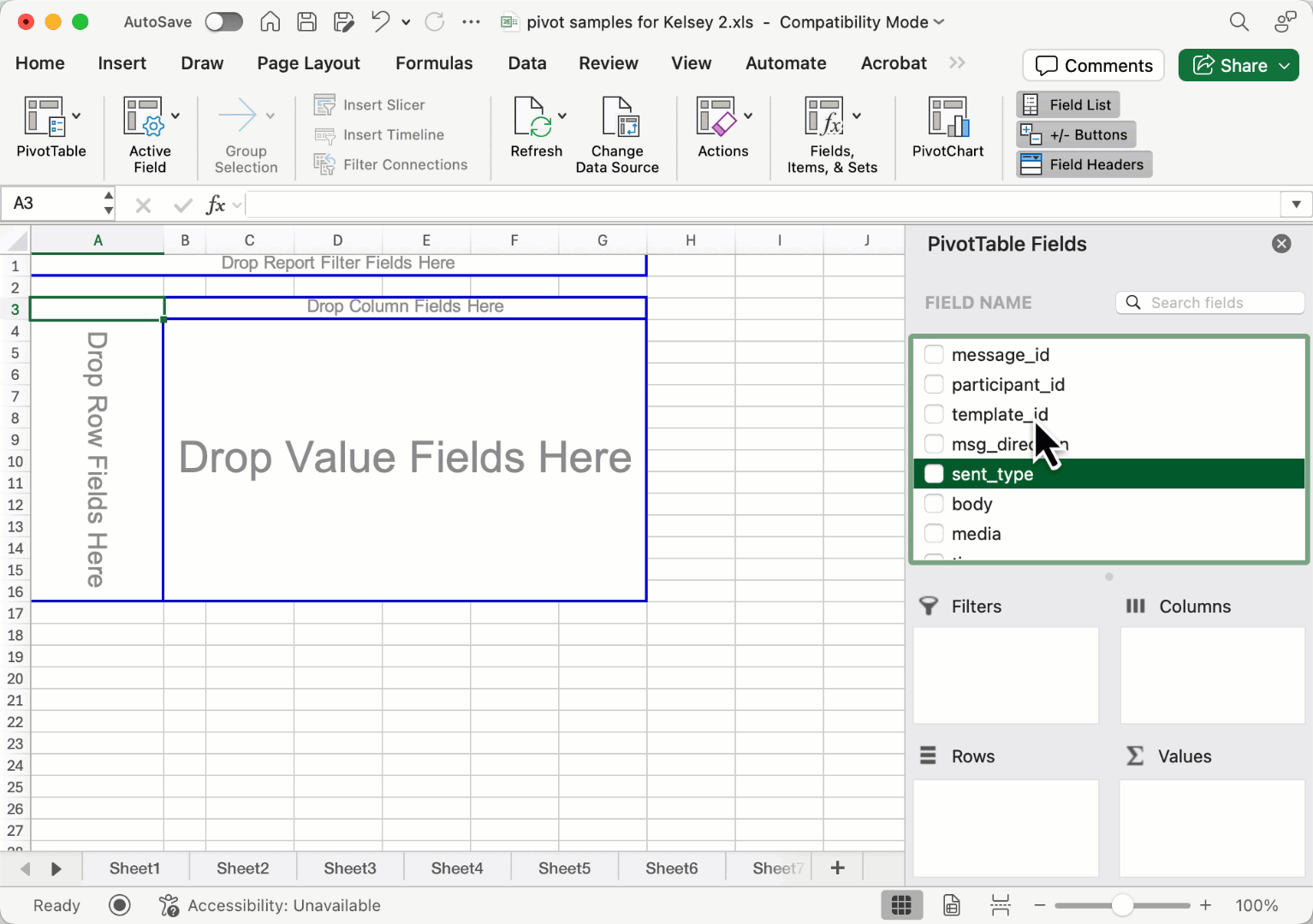 - In order to fill in data, you will select PivotTable fields and drag them into one of four areas: Filters, Columns, Rows, Values. See below for some suggested configurations!