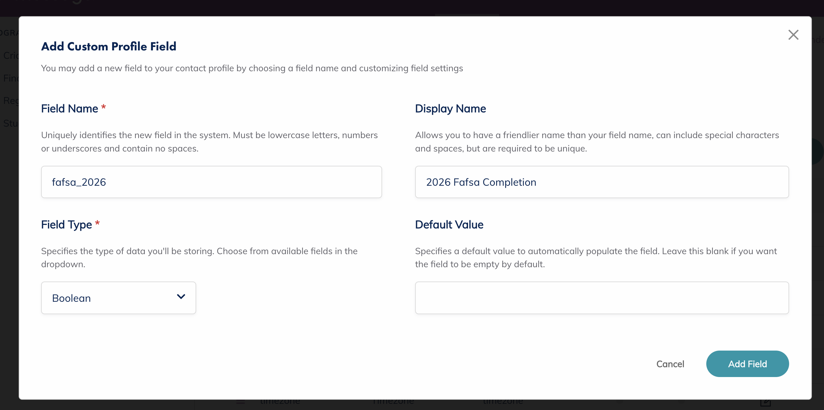 4. Create the field name using lower case letters and underscores. This should match the field name you have indicated in the 5th column on your program message template.